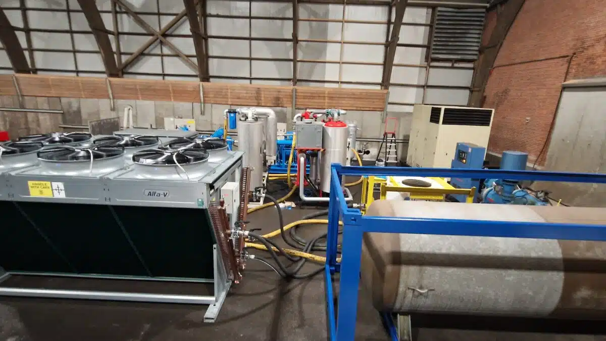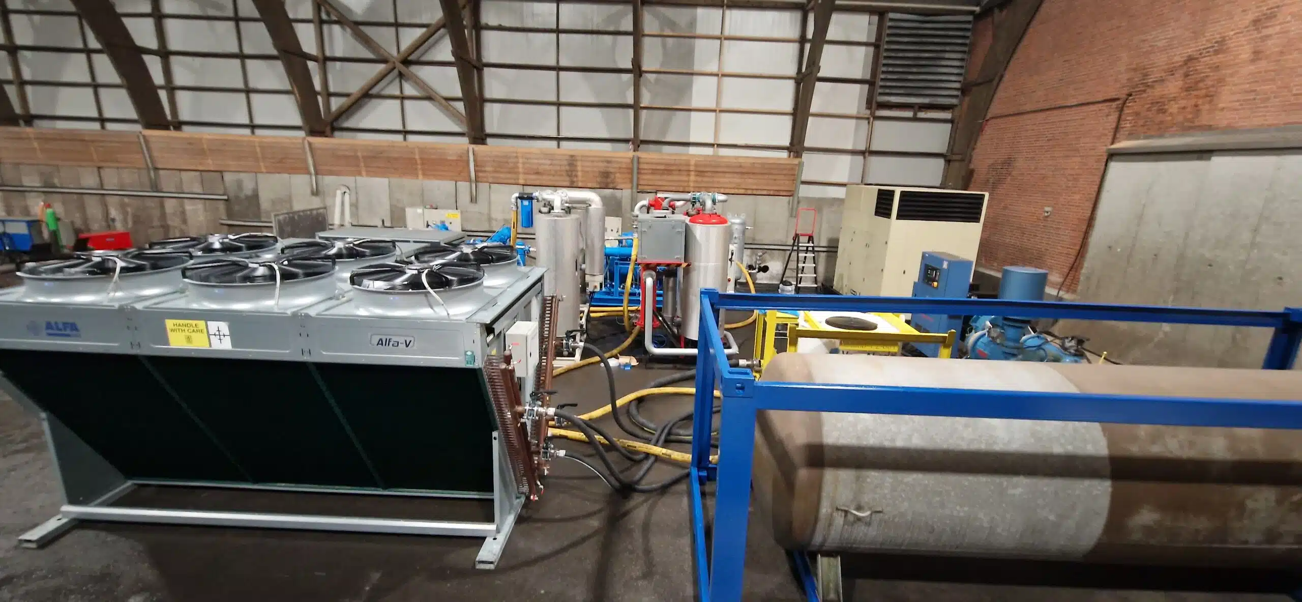 Voor dit project was de vraag om energie-efficiënt 490 kW koelvermogen te leveren aan een 16 bar olievrije persluchtcompressoropstelling. De uitdaging zat in de strikte geluidslimieten: de tijdelijke installatie moest voldoen aan beperkingen uit de overheidsvergunning.