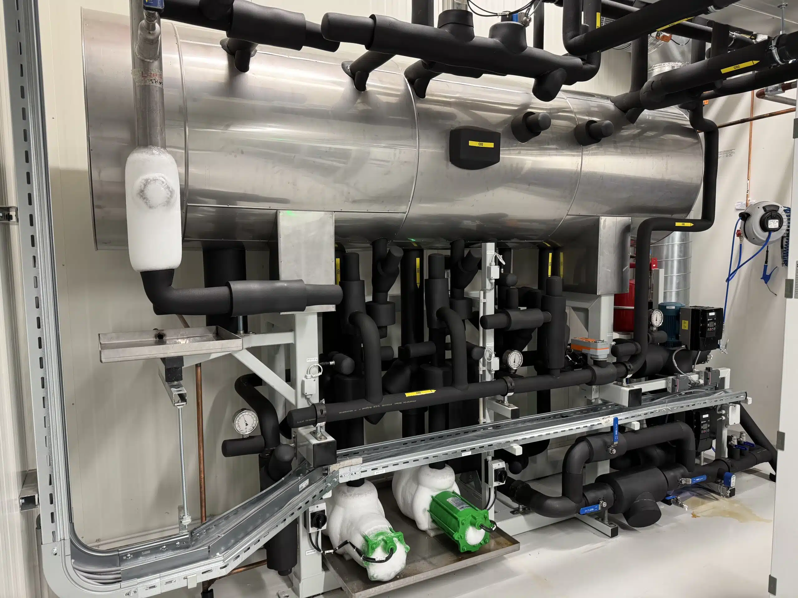 De geleverde koelinstallatie bestaat uit een transkritische CO₂-compressorunit met warmte-terugwinning. Vanwege de variatie in afnemers en temperatuurniveaus is gekozen voor een combinatie van drie systemen: